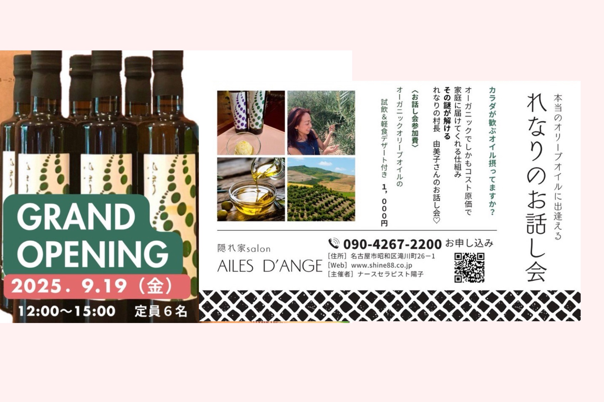 ◆愛知県名古屋市◆9月19日(金)お話会 延期 :2025年 投稿公開日:2025年7月23日 投稿カテゴリー:Event 名古屋でれなりお話会あります❣️ぜひご参加くださいね☆ 9月19日(金)お話会 12:00~15:00試食&軽食デザート付き 1000円 隠れ家salon AILES D`ANGE 名古屋市昭和区滝川町26-1申し込み 090-4267-2200 その他の記事を読む 前の投稿🈡◆埼玉県川口市◆9月17日(水)お話会 :2025年 次の投稿🈡◆愛知県岡崎市◆9月23日(祝・火)お話会 :2025年 おすすめ ◆沖縄県 南城市◆ 2月21日 お話会(軽食付き) 2022年2月14日 ◆奈良市◆ 6月14日 お茶会&試食会 2021年6月7日 🈡◆兵庫県姫路市◆5月24日(水)お話会 2023年5月15日